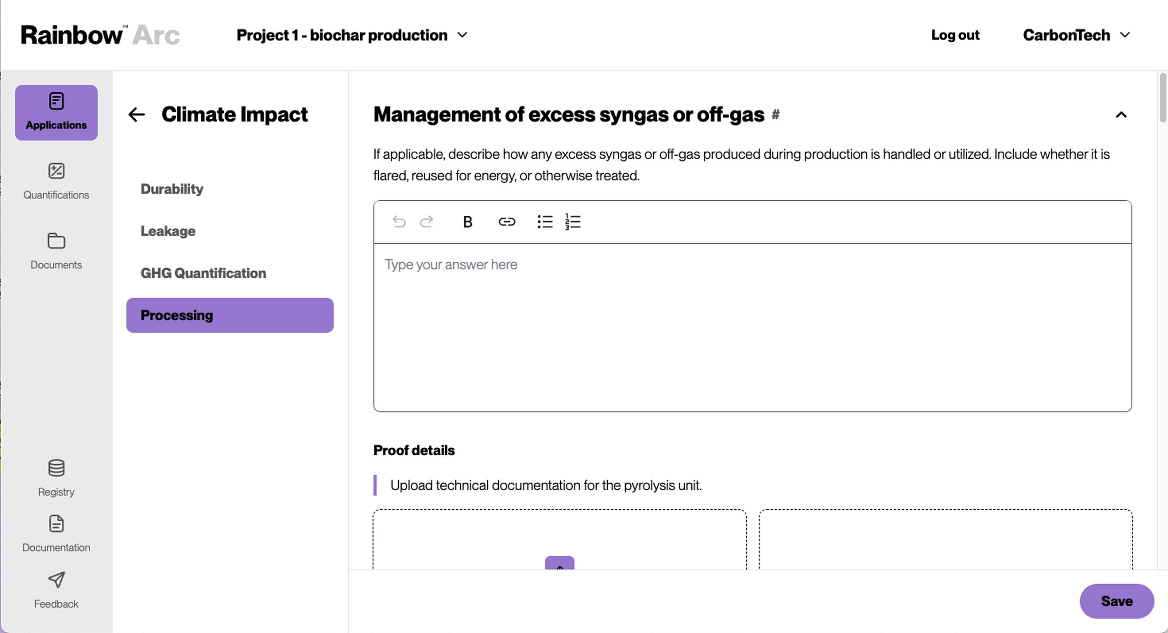 Arc, Rainbow’s certification platform, only surfaces questions that are relevant to each project's methodology, like this syngas management question for biochar projects.